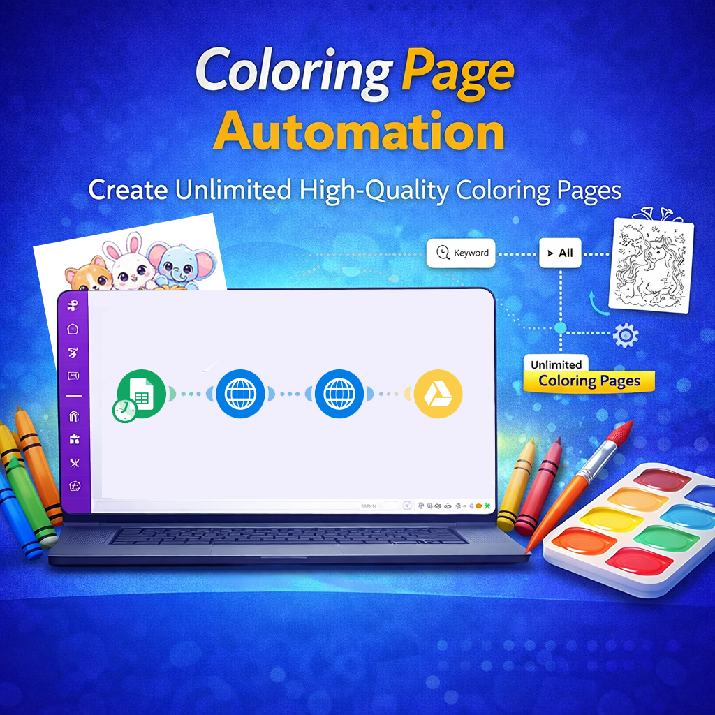 This automation is focused on creating the graphic assets and variations, not formatting or assembling a full coloring book for print. The real advantage is scalable graphic generation.